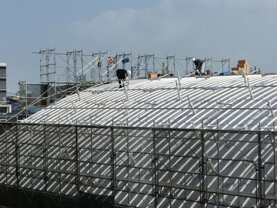 写真は体育館の屋根の上の様子で、撮影時の地上の温度は34℃でしたが、屋根の上はもっと暑かったはずです。