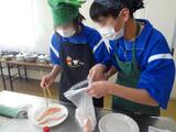 鮭の切り身に恐る恐る触れる生徒、躊躇なく触れて塩などを擦り込む生徒