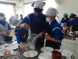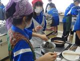 班毎に鮭の調理、すまし汁の調理、使用する食器類の洗浄、使用後の調理器具の洗浄など分担して取り組んでいました。