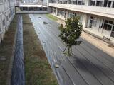 もう地面が緑色になり始めているので、体育館裏と校舎中庭に、今のうちに防草シートを張ることにしました。