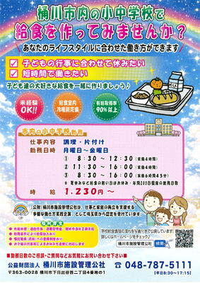 公益財団法人桶川市施設管理公社では、市内小・中学校の給食調理員を募集しています。